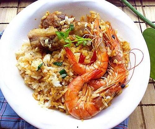 6. 加入虾和配料:将炒好的虾和配料均匀地铺在米饭上。
